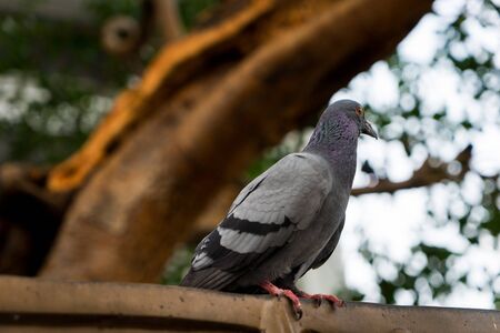 Pigeon on a perch in the park, close up. Beautiful doves in nature. Domestic pigeons