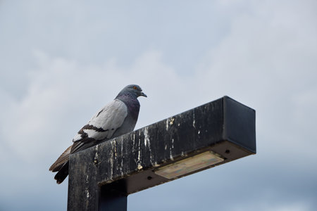 A pigeon is comfortably perched on a street light, beautifully contrasting the sky above it