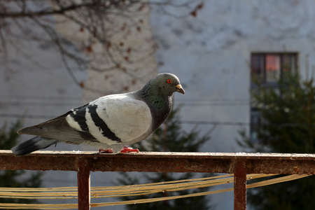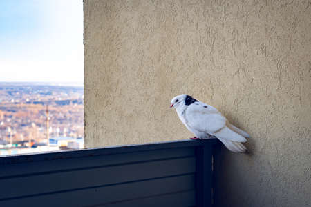 A white pigeon is sitting on the edge of the balcony, having woken up after sleeping. A street pigeon sits on the edge of the balcony early in the morning.