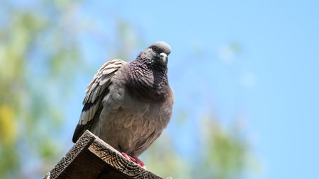 portrait of curious pigeon on a birdhouse