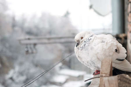 White pigeon on the snow-covered windowsill on a frosty day. The bird freezes in cold winter. Selective focus