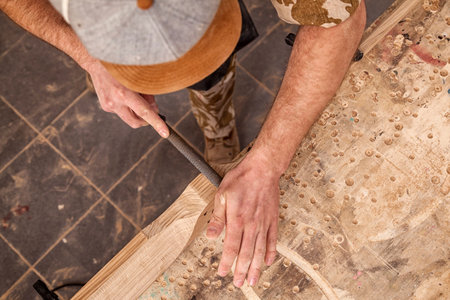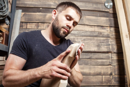 The carpenter was working furniture wood in studio