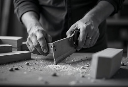 Manual saw cutting through wood plank on workbench during carpentry project