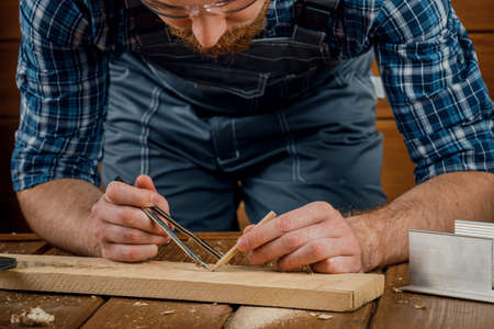 A close up of a male carpenter marks with a metal compass and pencil on a wooden bar