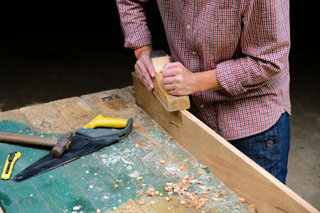 Close up of young man builder wearing in a plaid shirt treating a wooden product with a chisel in the workshop, close-up