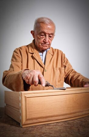 Senior wood carving professional during work