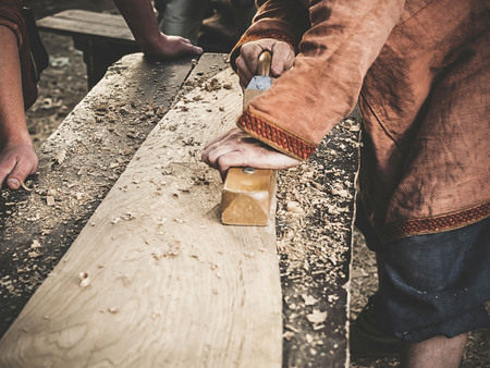 Carpenter in Medieval Cotton Clothes Working With a Wood by Plane. Man Manually Hews a Wooden Board With a Plane. Construction of a wooden bark