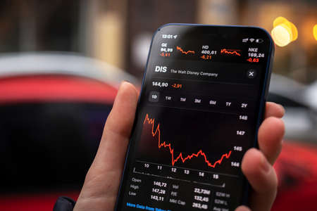 Kharkov, Ukraine - December 1, 2021: The Wault Disney Company stock trade. Financial graphs, investment, digital banking concept photo. Smartphone with stock market app in hand