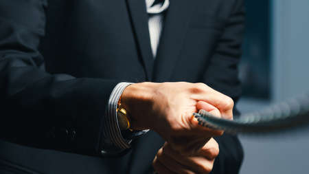 man in suit twists the screwdriver a screw. businessman for dirty work