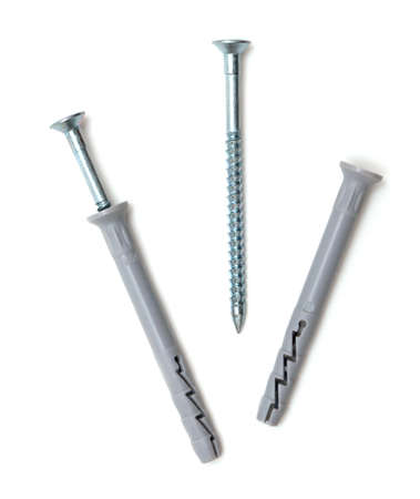 Plastic dowels isolated on white background. Wall plug, screw anchor, construction tools.