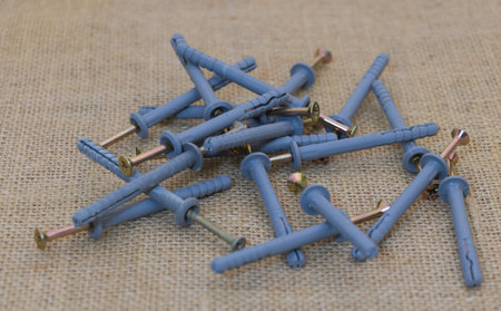Group of Dowels and Nails on wooden background. Dowels for fastening in concrete. Stock photo.