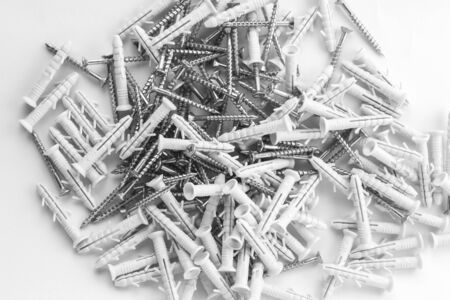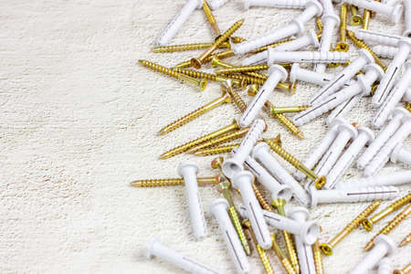 Plastic anchor and bolts on background, construction tool.