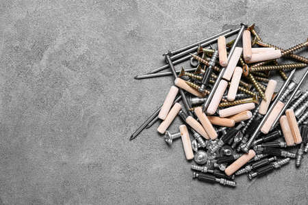 Pile of different nuts, bolts, screws, nails and dowels on gray background