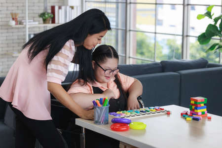young girl is having fun practicing and learning with toys at home with her mother to develop her skills