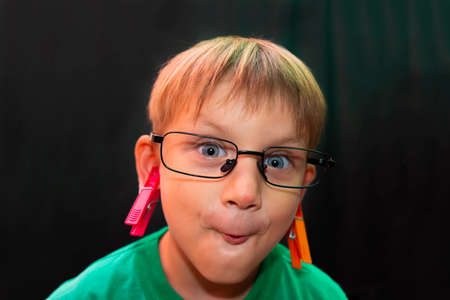 Casual boy in glasses shows different faces to the camera on a dark background