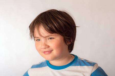 Portrait of smiling laughing teenager boy with Down syndrome silver background. Advertising children's cosmetics, products, hair care products, medicines, perfumes, cosmetology, courses, schools, colleges and trainings. Genetic disease world day