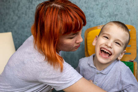 Boy with cerebral palsy and his mom in the conditions of his apartment. Boy reacts vividly to everything that happens around him and shows it with his personality. High quality photo