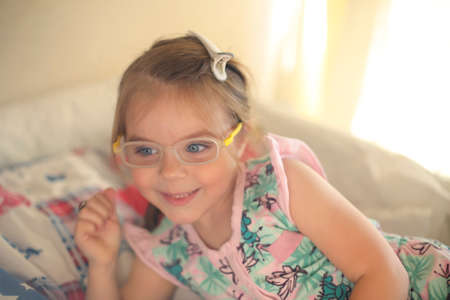 Children's eye concept. Cute adorable little girl with deep blue eyes wearing eyeglasses smiling while playing at home. Happy positive kid with poor vision wearing glasses