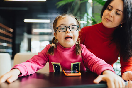 Portrait of carefree mother and daughter with down syndrome sitting at table in indoor cafe together.