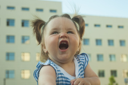 portrait of a joyful young child outdoors, baby girl on urban landscape background