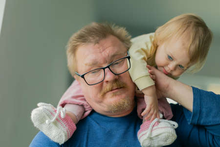 Grandfather and granddaughter together talking about entertainment media on TV. Old senior use conversation communicate with young generation cross generation gap strengthen family bond. Divergence.