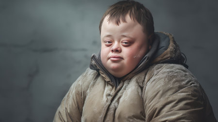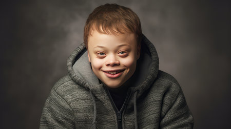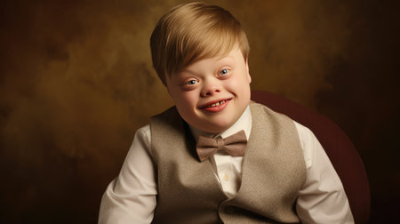 touching portrait white boy with Down Syndrome with his infectious smile