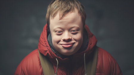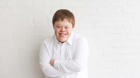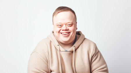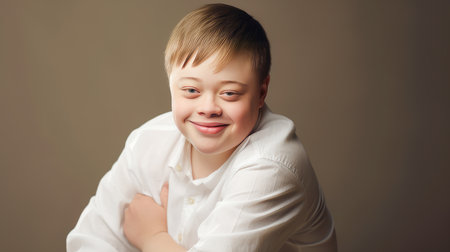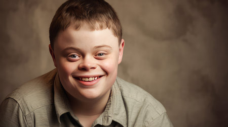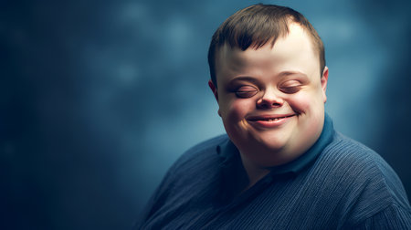 young man with Down syndrome is captured in a touching moment. He has a bright, joyful smile that radiates happiness.