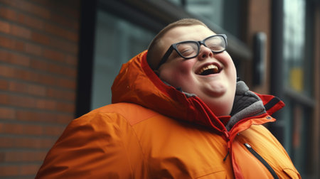 A man with Down syndrome in an orange coat and glasses is laughing. AI