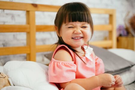 Portrait of little girl smiling on background of the wall