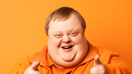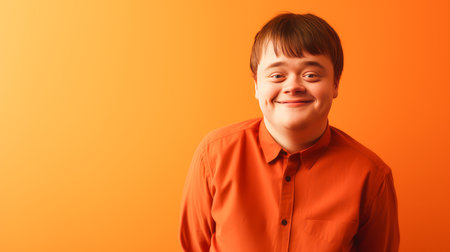 Portrait of smiling laughing man with Down syndrome orange background. Advertisement of men's cosmetics products, hair care products, medicines, perfumes, cosmetology, courses, school college and trainings. lifestyle, World Day of Genetic Diseases