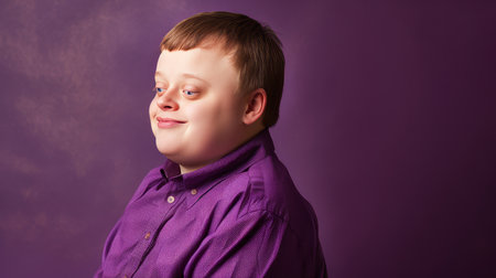 Portrait of smiling laughing teenager guy with Down syndrome purple background. Advertising children's cosmetics, products, hair care products, medicines, perfumes, cosmetology, courses, schools, colleges and trainings. Genetic disease world day
