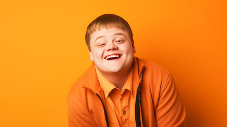 Portrait of smiling laughing teenager boy with Down syndrome orange background. Advertising children's cosmetics, products, hair care products, medicines, perfumes, cosmetology, courses, schools, colleges and trainings. Genetic disease world day