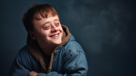 Portrait of smiling laughing boy child with Down syndrome blue background. Advertising of children's cosmetics, products, hair care products, medicines, perfumes, cosmetology courses, schools, colleges and trainings. Genetic disease world day concept