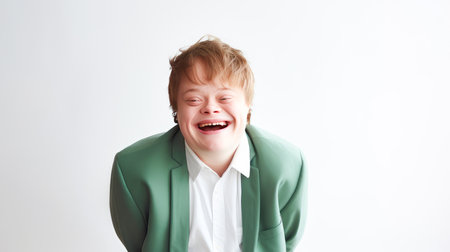 Portrait of smiling laughing man with Down syndrome white background. Advertisement of men's cosmetics products, hair care products, medicines, perfumes, cosmetology, courses, school college and trainings. lifestyle, World Day of Genetic Diseases