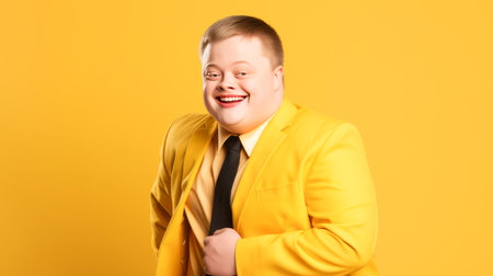 Portrait of smiling laughing man with Down syndrome yellow background. Advertisement of men's cosmetics products, hair care products, medicines, perfumes, cosmetology, courses, school college and trainings. lifestyle, World Day of Genetic Diseases