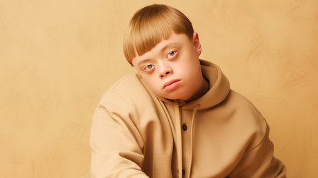 Portrait of smiling laughing teenager guy with Down syndrome creamy beige background. Advertising children's cosmetics, products, hair care products, medicines, perfumes, cosmetology, courses, schools, colleges and trainings. Genetic disease world day