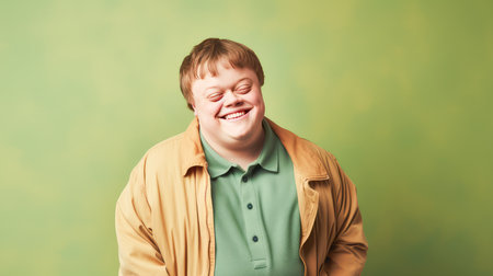 Portrait of smiling laughing man with Down syndrome green background. Advertisement of men's cosmetics products, hair care products, medicines, perfumes, cosmetology, courses, school college and trainings. lifestyle, World Day of Genetic Diseases