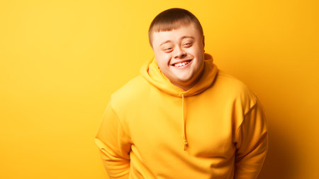 Portrait of smiling laughing teenager guy with Down syndrome yellow background. Advertising children's cosmetics, products, hair care products, medicines, perfumes, cosmetology, courses, schools, colleges and trainings. Genetic disease world day