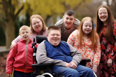 Laughter-filled park gathering: person with Down syndrome at the center.