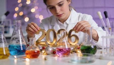female scientist arranging 2026 numbers in festive laboratory setting with colorful chemical solutions and holiday decorations.