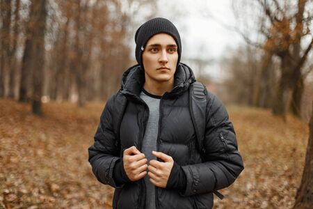 Handsome young man in winter clothes with a backpack on the background of an autumn forest.