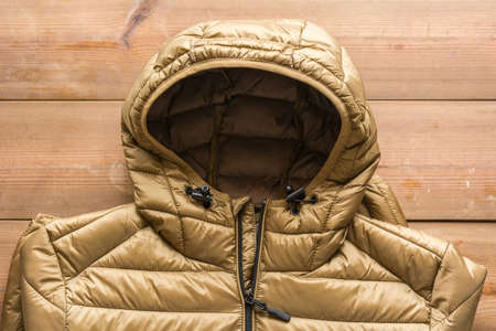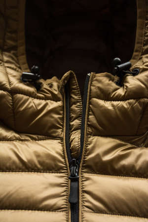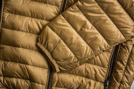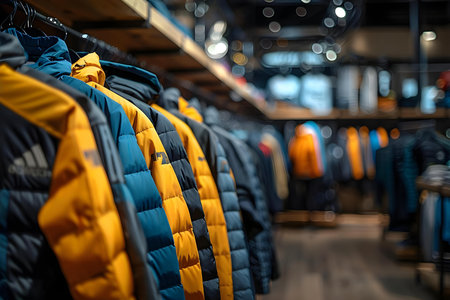 New winter jackets on a market counter close up background.