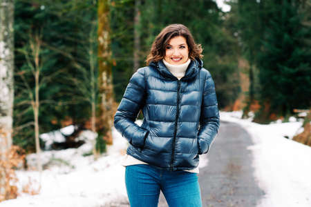 young woman are walking in the winter park. Winter park in the snow. Clothing advertising photo concept.