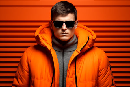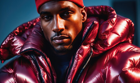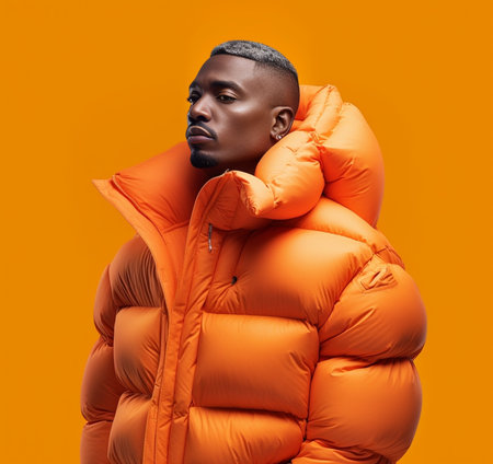 Headshot of serious young African American male model dressed in stylish orange winter jacket over white tshirt posing isolated at blank studio wall People style fashion : Generative AI