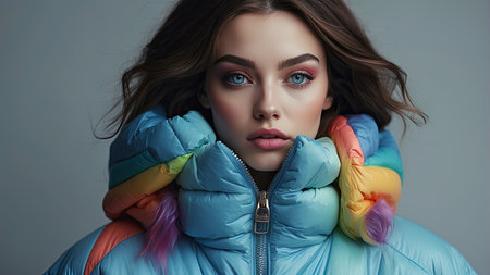 Blue puffer jacket against gradient background, fashion and winter clothing concept