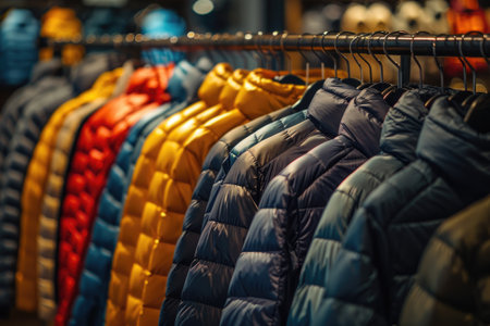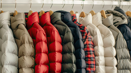 Closeup of colorful winter jackets on hangers in fashion store showroom