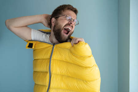 Man climbed into a yellow sleeping bag while standing indoors against a wall, imagining himself a tourist, yawns and stretches.