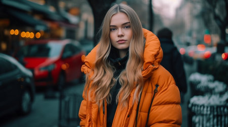 Autumn winter in the city beautiful young woman posing on the street : Generative AI