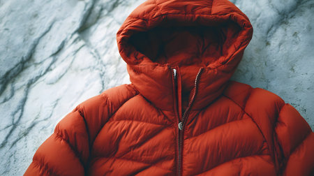 A vibrant orange puffer coat is thoughtfully placed on a blanket of pristine white snow, highlighting the contrast of winter fashion in a serene setting.