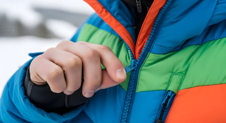 A close-up shot of a person's hand zipping up the front of a colorful puffer jacket in blue, green, and orange. The background is a blurry, snowy landscape, indicating a cold, winter environment. The action suggests getting ready for warmth and outdoor activity.